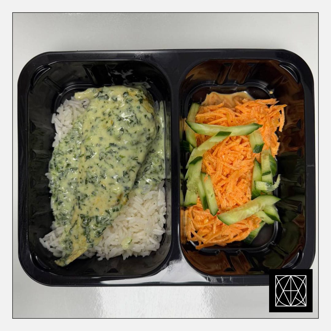 Vištienos krūtinėlė su špinatų padažu, pateikiama su ryžiais ir morkų salotomis, gardintomis agurkais