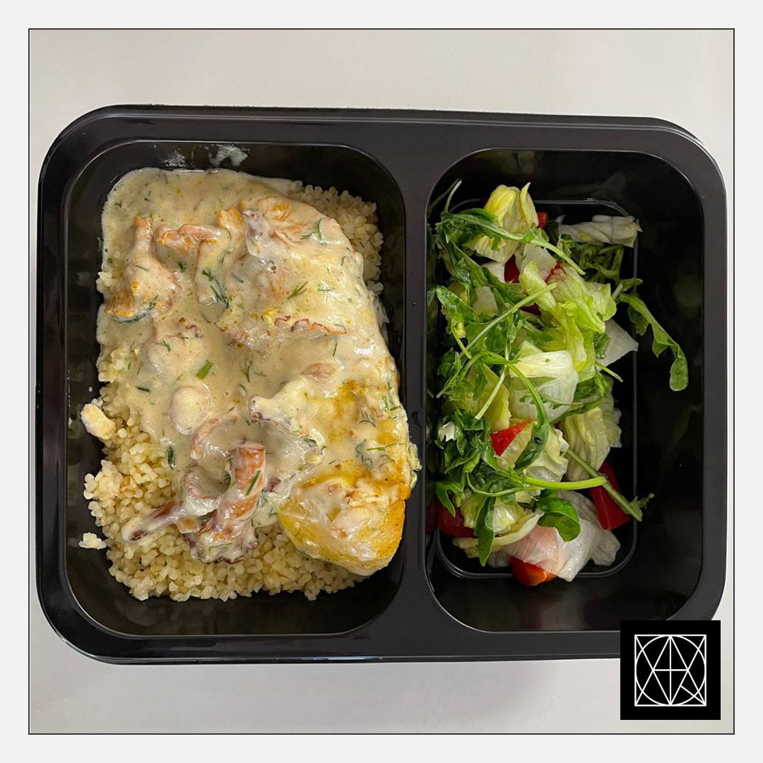 Vištienos krūtinėlė su voveraičių padažu, pateikiama su bulguro rizotu ir šviežiomis salotomis