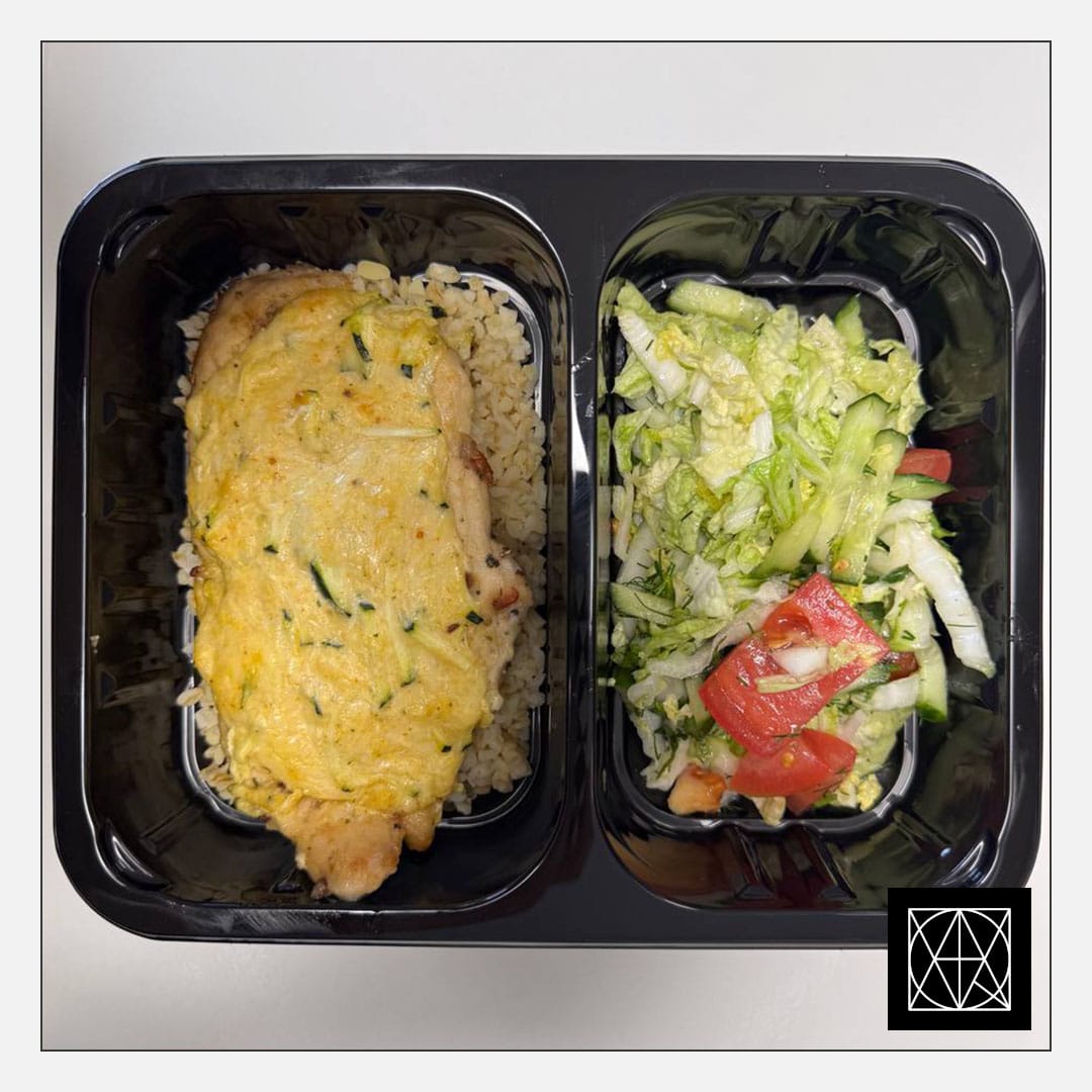 Vištienos filė, užkepta cukinija ir sūriu, pateikiama su bulguru ir šviežiomis salotomis