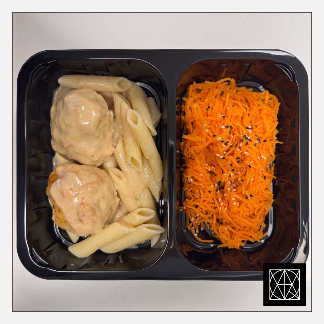 produkto kiekis: Vištienos kukuliai, pateikiami su makaronais ir korėjietiškomis morkomis