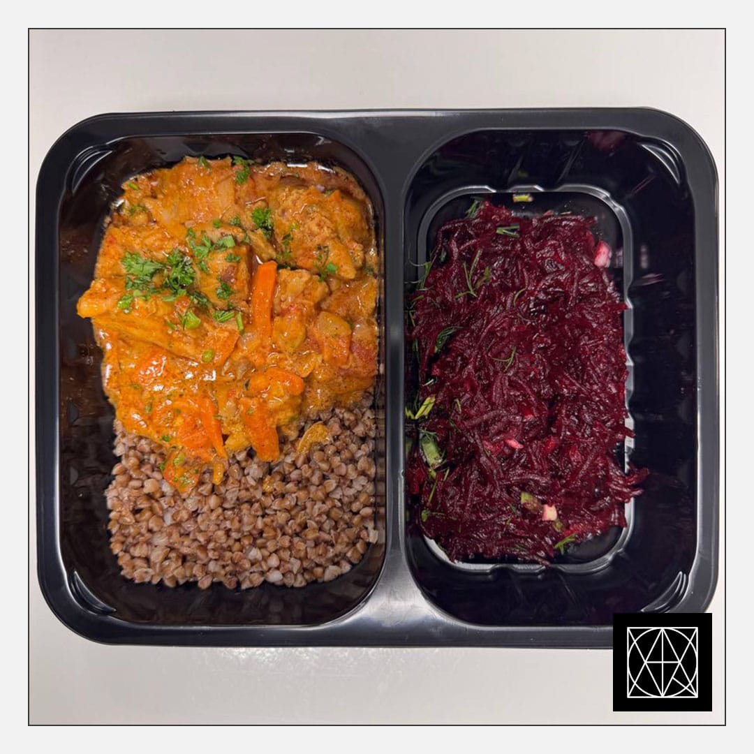 produkto kiekis: Vištienos troškinys „Tikka masala“, pateikiamas su grikiais ir burokėlių salotomis
