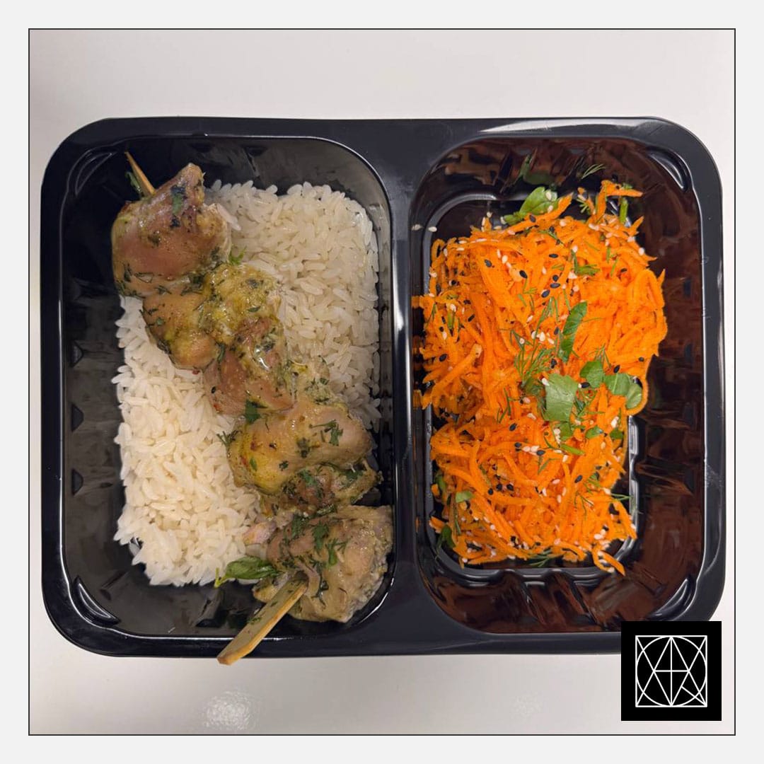 Vištienos vėrinukas, pateikiamas su ryžiais ir morkų salotomis, gardintomis sezamais