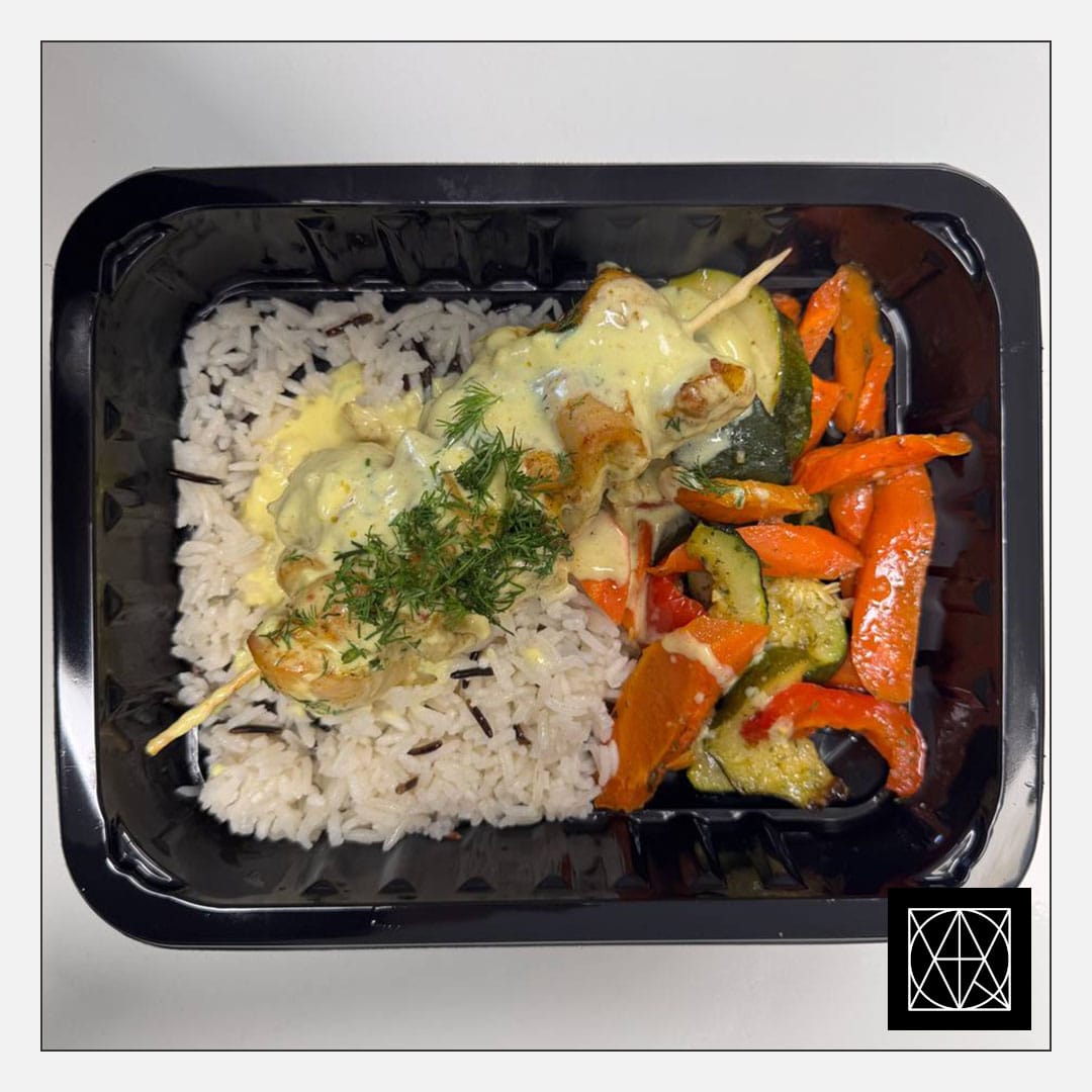 Vištienos vėrinukas su kario padažu, pateikiamas su laukiniais ryžiais ir karštomis daržovėmis