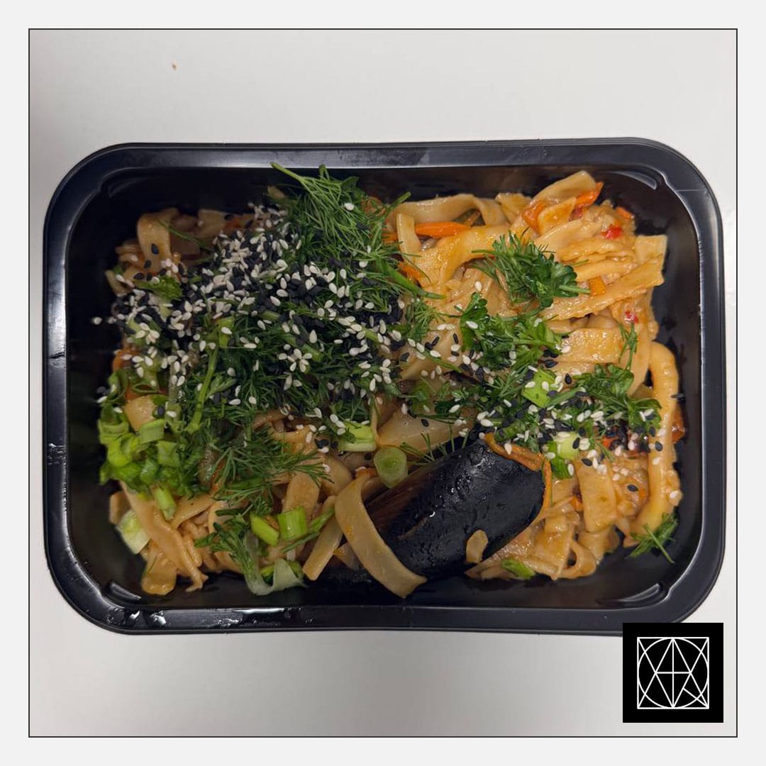 WOK makaronai su jūros gėrybėmis, paprikomis, wok daržovėmis, kepintais sezamais, svogūnų laiškais ir saldžiarūgščiu padažu