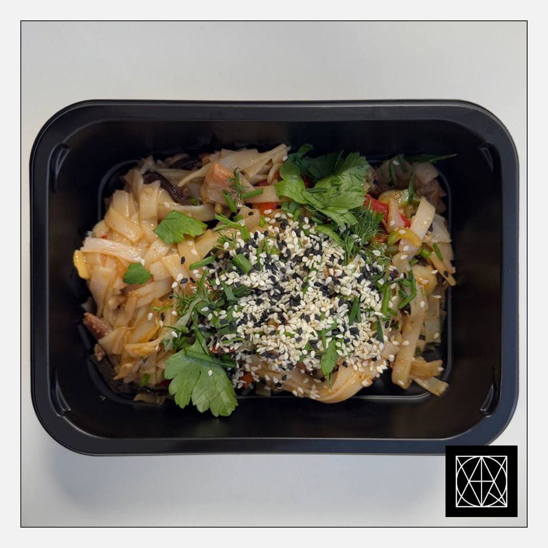 WOK makaronai su vištienos blauzdelių mėsa, paprikomis, cukinija, wok daržovėmis, kepintais sezamais, svogūnų laiškais ir saldžiarūgščiu padažu
