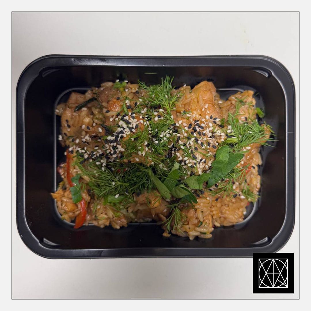 WOK su vištienos blauzdelių mėsa, ryžiais, kepta cukinija, paprikomis, morkomis, kepintais sezamais, svogūnų laiškais ir saldžiarūgščiu padažu
