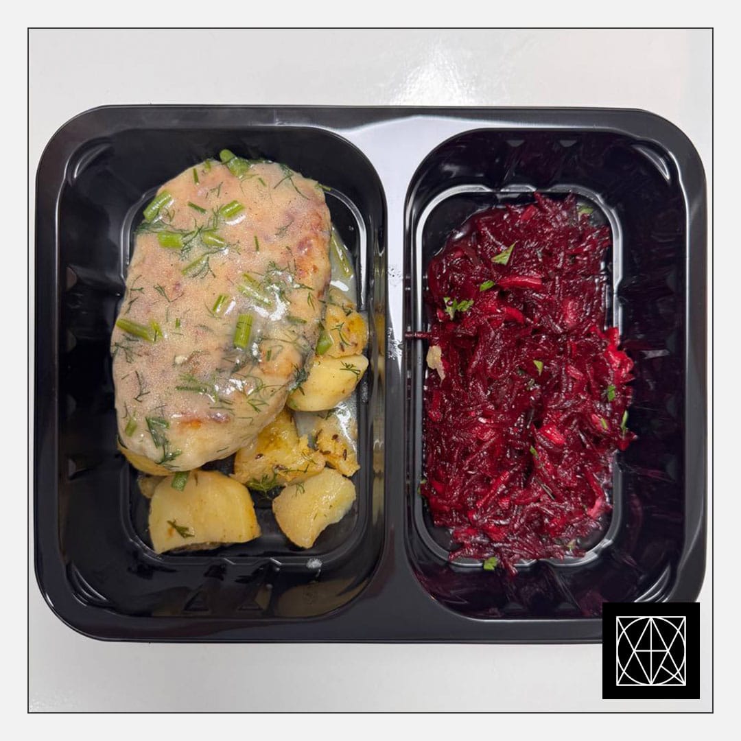 produkto kiekis: Žuvies kotletas, pateikiamas su keptomis bulvėmis ir burokėlių salotomis
